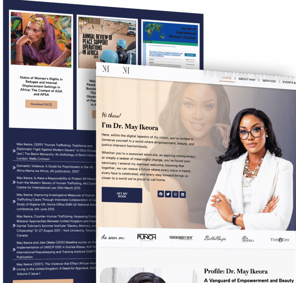 A modern website showcasing Dr. May Ikeora’s work in advocacy, entrepreneurship, and women’s empowerment. It highlights her initiatives, publications, and brand, blending empowerment, justice, and identity.