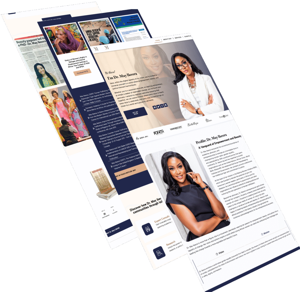 A modern website showcasing Dr. May Ikeora’s work in advocacy, entrepreneurship, and women’s empowerment. It highlights her initiatives, publications, and brand, blending empowerment, justice, and identity.